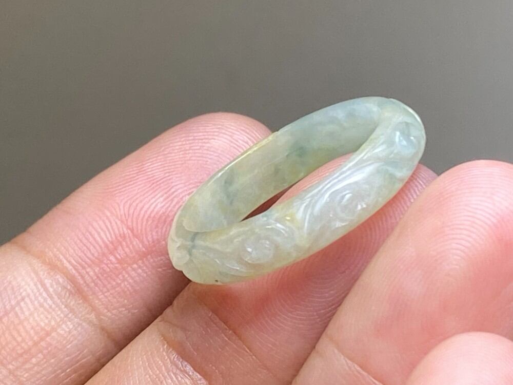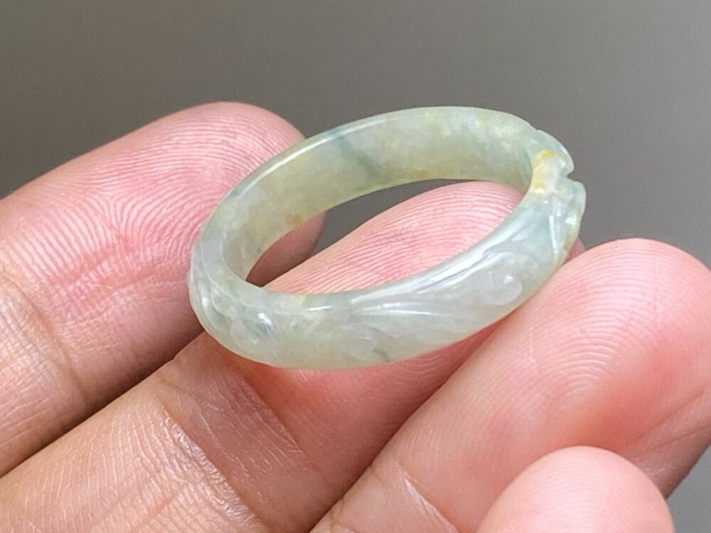 L11-205 氷種 彫花藤草 薄黄色 19.5号 ミャンマー産 A貨 本翡翠 くりぬき リング 黄翡翠