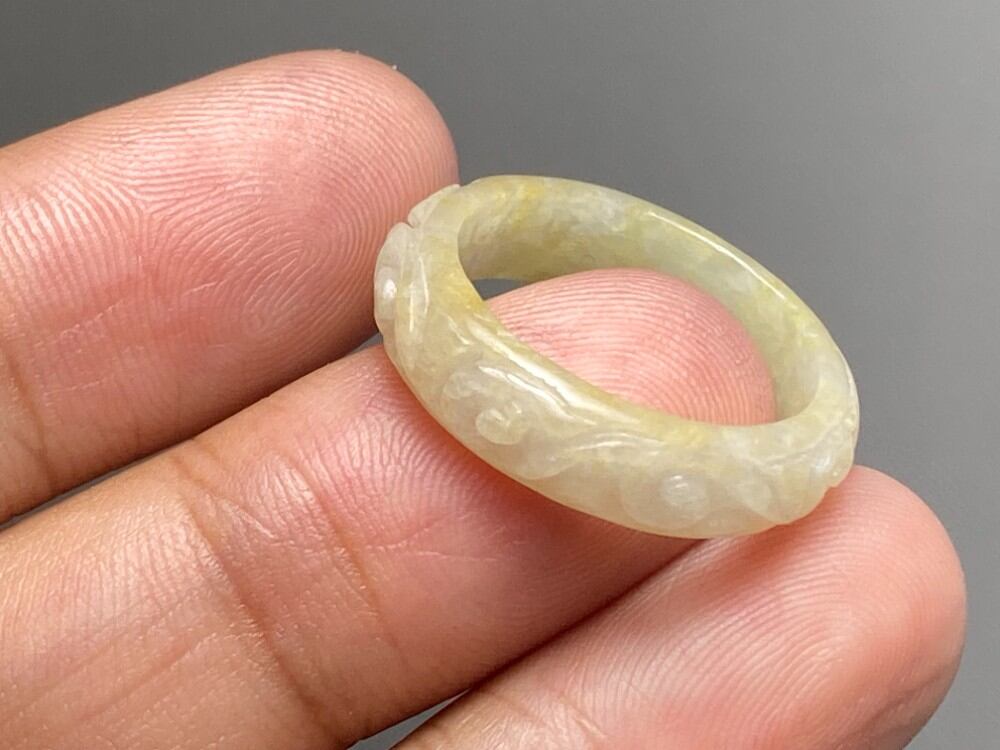 L11-203 氷種 彫花藤草 薄黄色 13.5号 ミャンマー産 A貨 本翡翠 くりぬき リング 黄翡翠