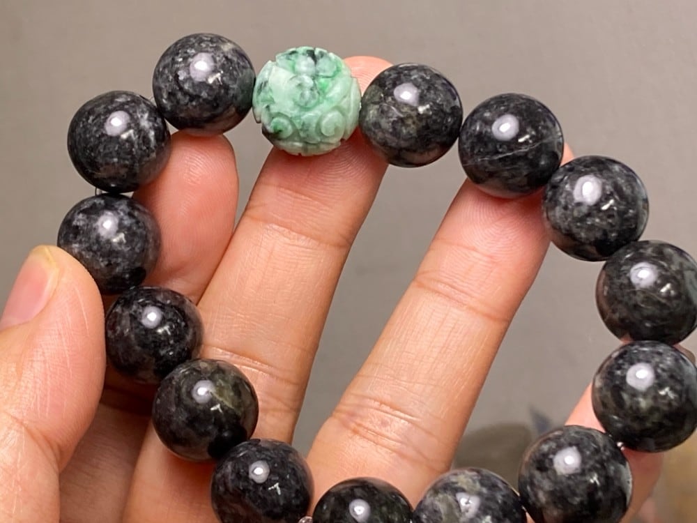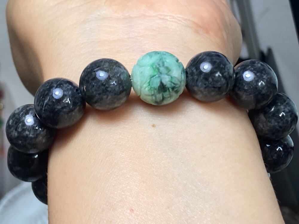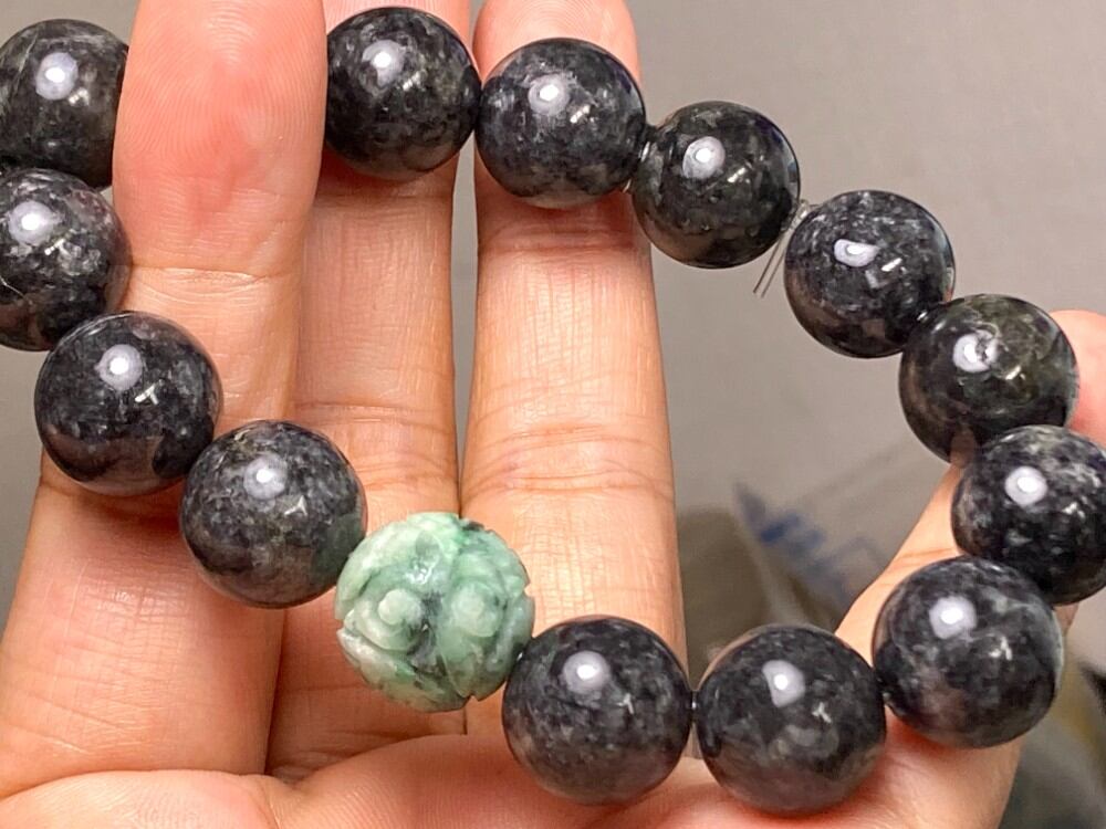 BR7-26 黒翡翠 彫り 福寿団花珠 13.0mm ミャンマー産 天然本翡翠 ブレスレット