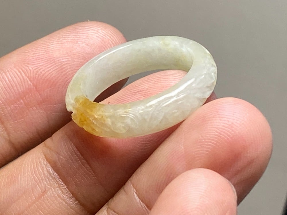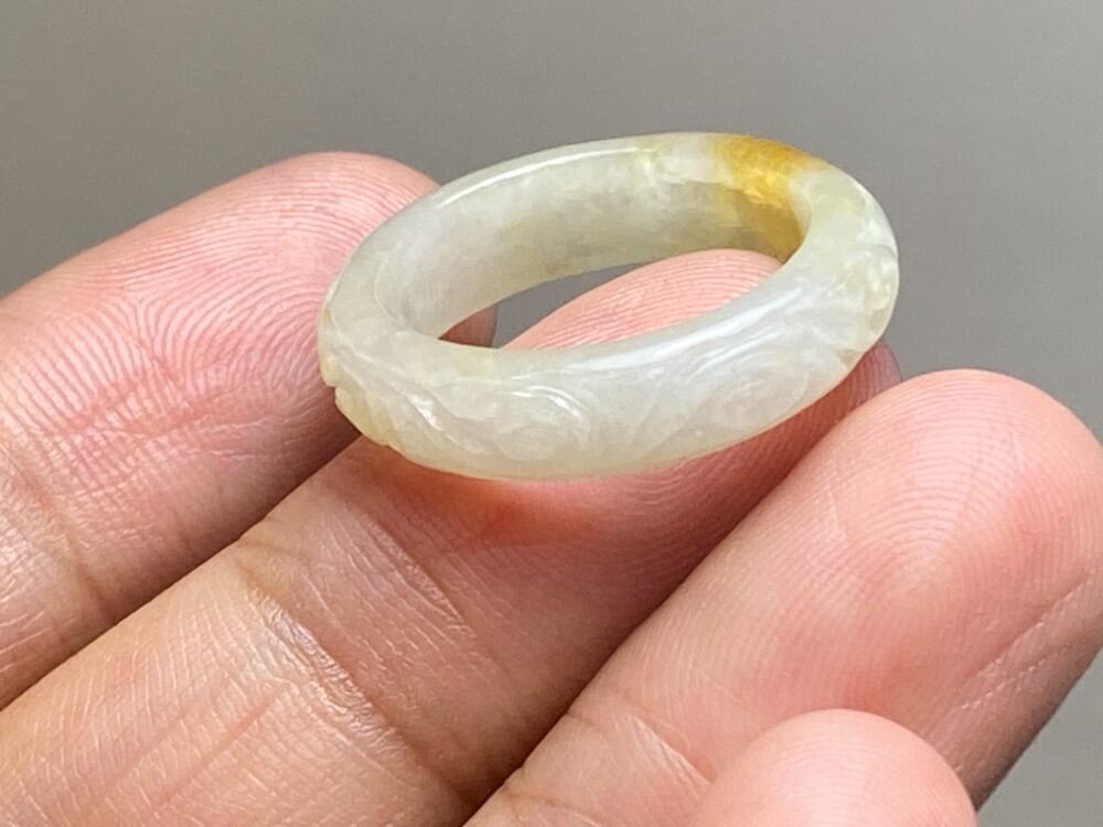 L11-208 氷種 彫花藤草 薄黄色 13.5号 ミャンマー産 A貨 本翡翠 くりぬき リング 黄翡翠
