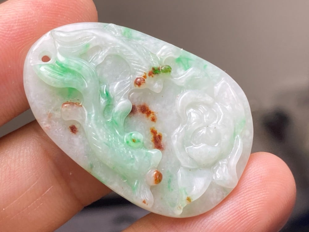 RS11-132 手彫り 金魚 ボダン ペンダント ミャンマー産 A貨 本翡翠 ルース