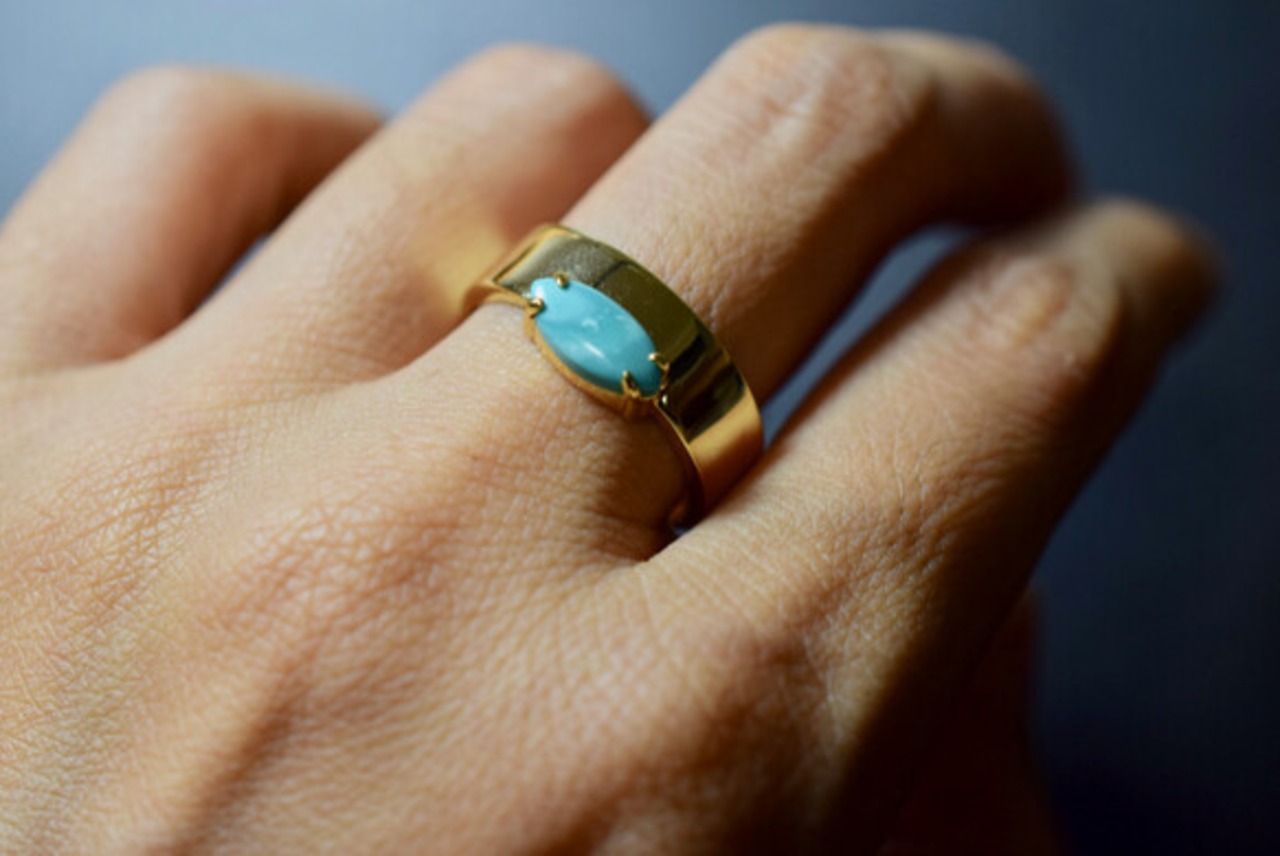 それは天然ターコイズの魅力と楽しみ、マーキースカットお形であんまり大きくなくても目を惹きます