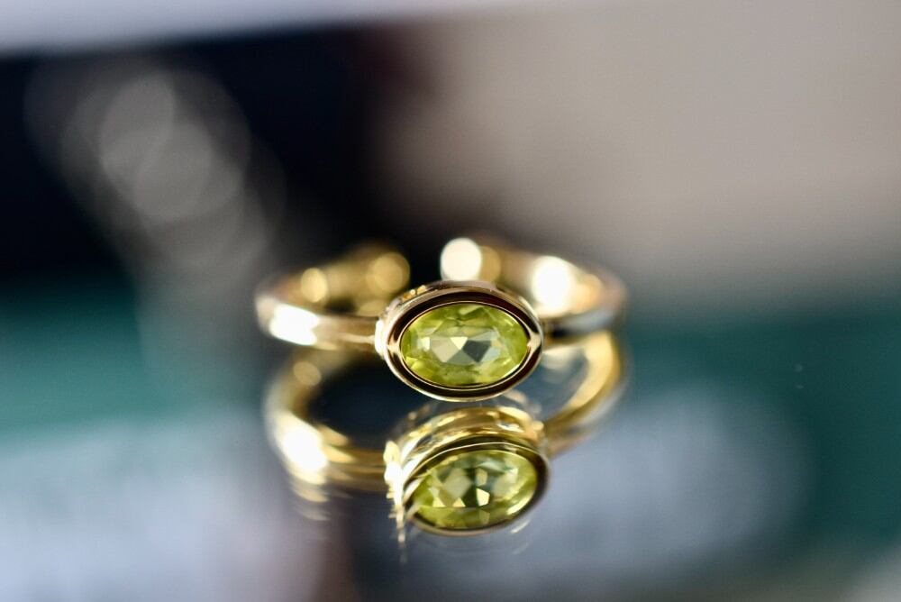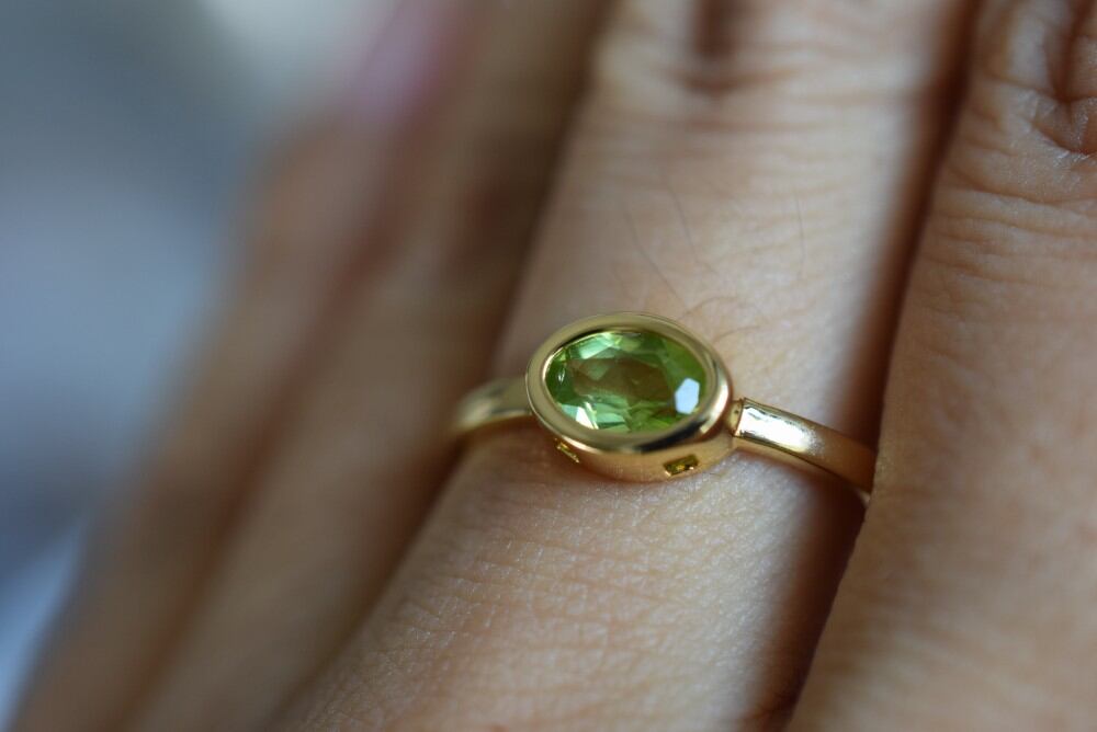 RG04 天然 細工製作 宝石質 天然 碧の宝石 ペリドット 太陽の石 覆輪留 リング 指輪 イエローゴールド フリーサイズ 18KGP 金属アレルギー対応 プレゼント お祝い