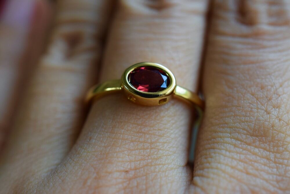 RG05 天然 細工製作 宝石質 天然 ガーネット 柘榴石 覆輪留 リング 指輪 イエローゴールド フリーサイズ 18KGP 金属アレルギー対応 プレゼント お祝い