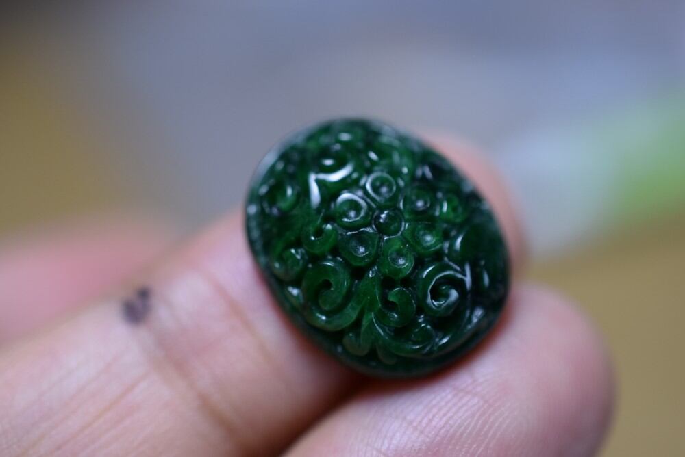 上品 手彫り 花型 ミャンマー産 深緑 本翡翠( 硬玉 、ジェダイト、含浸処理なし