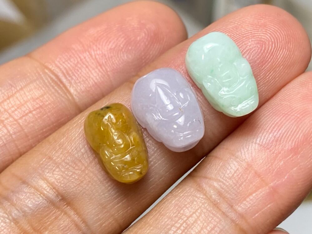 3点セット 通穴 貔貅 薄ラベンダー 薄緑 黄色 本翡翠 ミャンマー産 A貨 財布貔貅 御守、一点物です