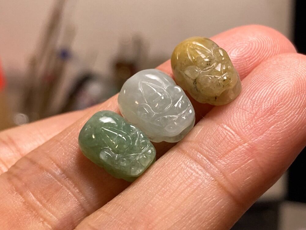 3点セット 通穴 貔貅 白瓷 薄緑 黄色 本翡翠 ミャンマー産 A貨 財布貔貅 御守、一点物です