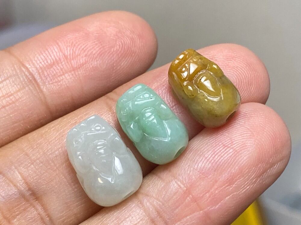 3点セット 通穴 貔貅 白瓷 薄緑 黄色 本翡翠 ミャンマー産 A貨 財布貔貅 御守、一点物です